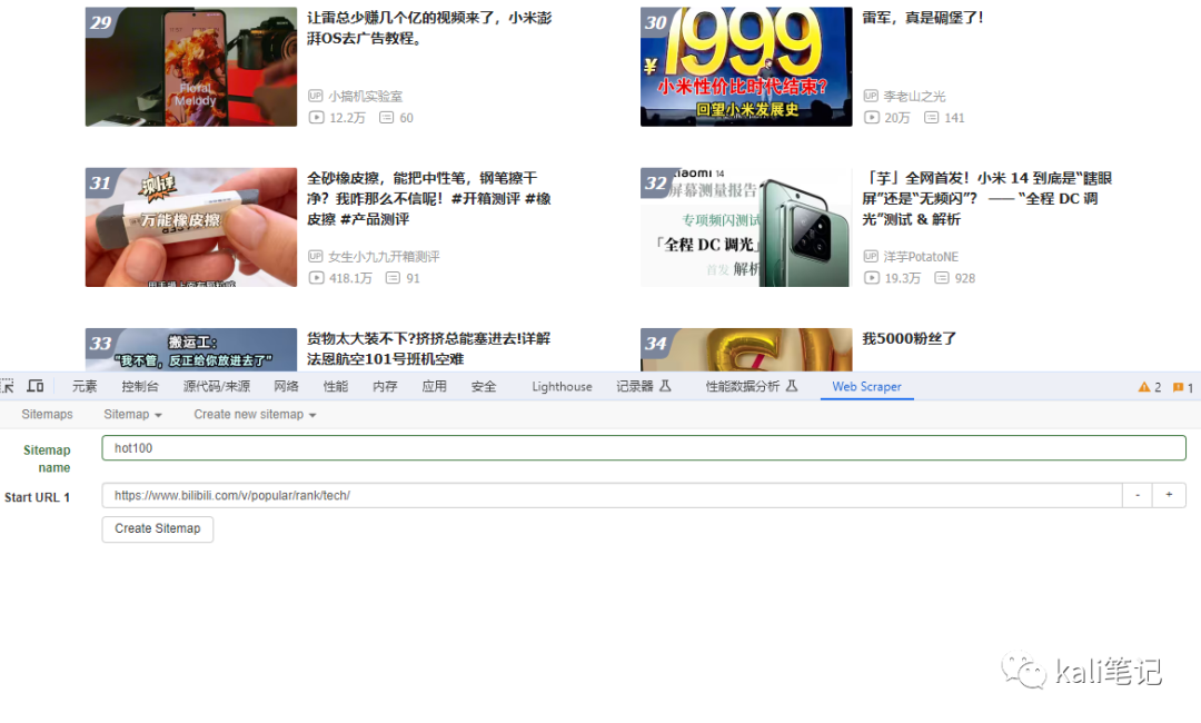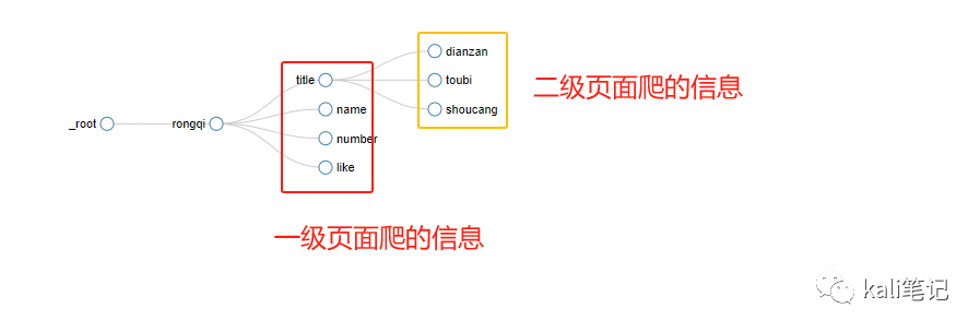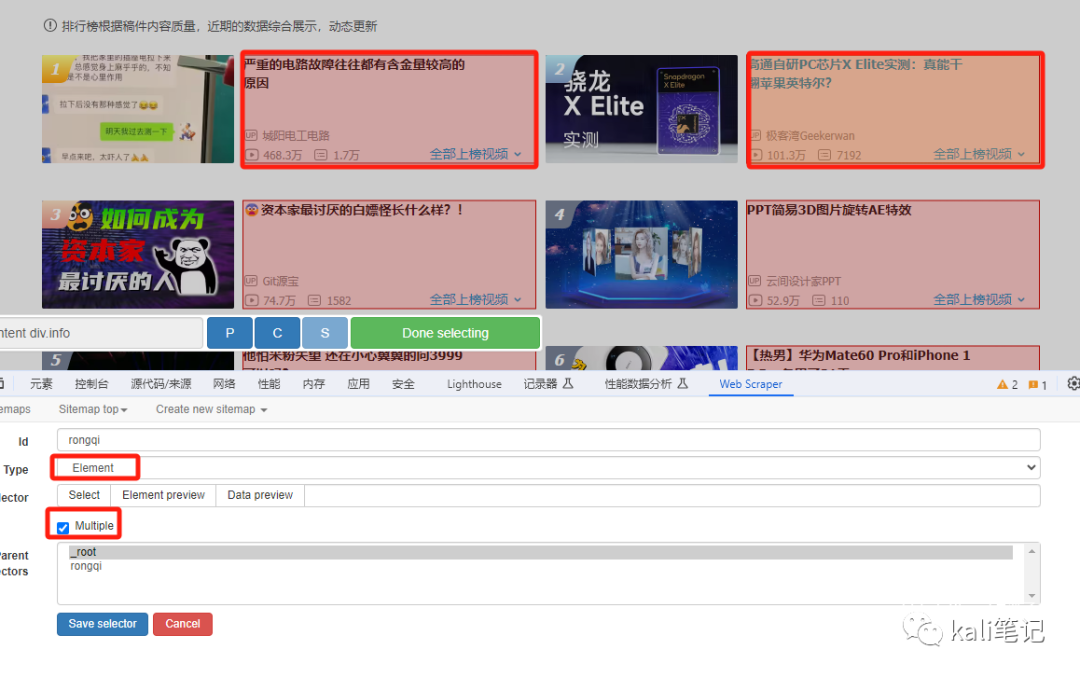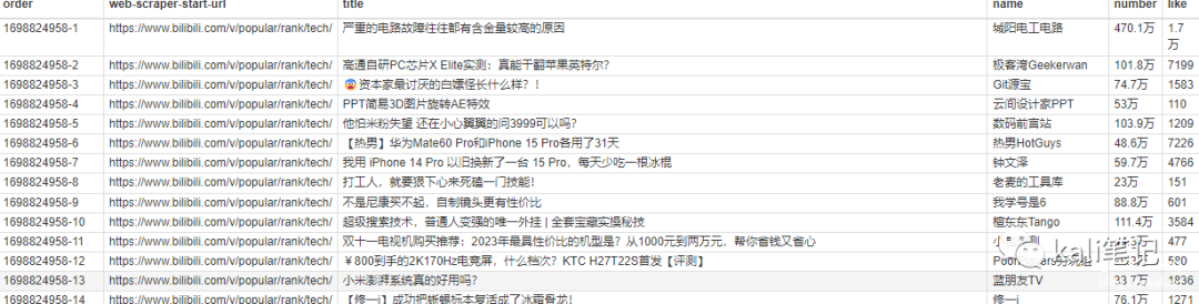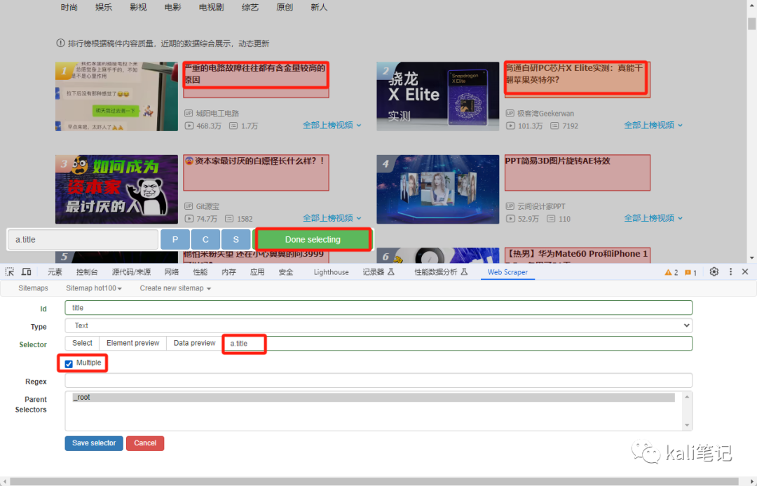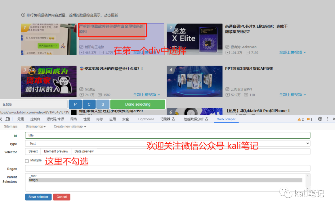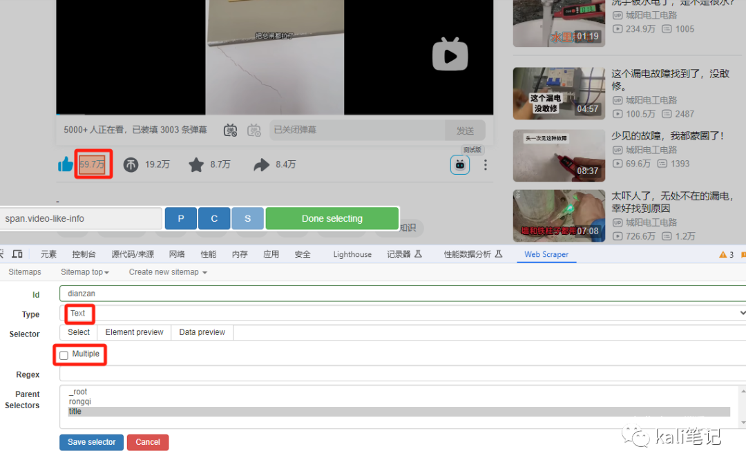 如在上诉的案例中,我们只获取到了播放量和弹幕数。在b站中核心的点赞投币数以及收藏数量并没有呈现。而是在二级页面中。这时,需要我们在第一个页面爬完后,跳转到第二个页面中去爬。具体做法如下:进入容器,选择title