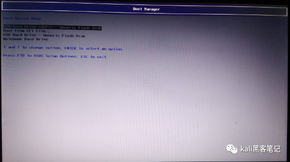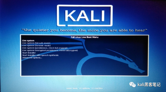 选择我们的U盘设备后,会出现kali的boot引导页面。