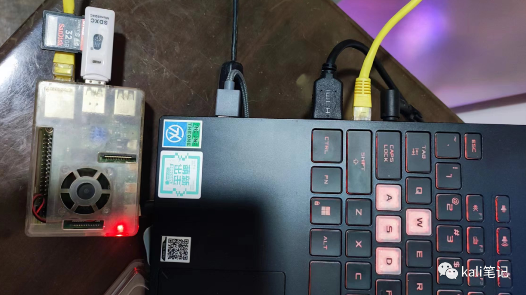 root 密码:password故而,我们需要将网线一头插到电脑,一头插到树莓派。效果如下: