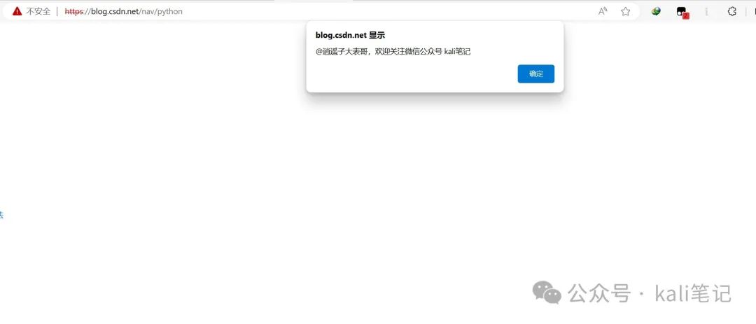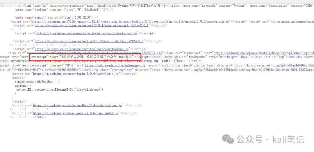 '<script type="text/javascript">alert("@逍遥子大表哥,欢迎关注微信公众号 kali笔记")</script></head>'