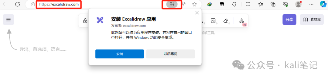 如下是windows的Edge浏览器打开在线网址https://excalidraw.com,通过如图标记图标,即可安装在本地,并在桌面创建快捷方式。