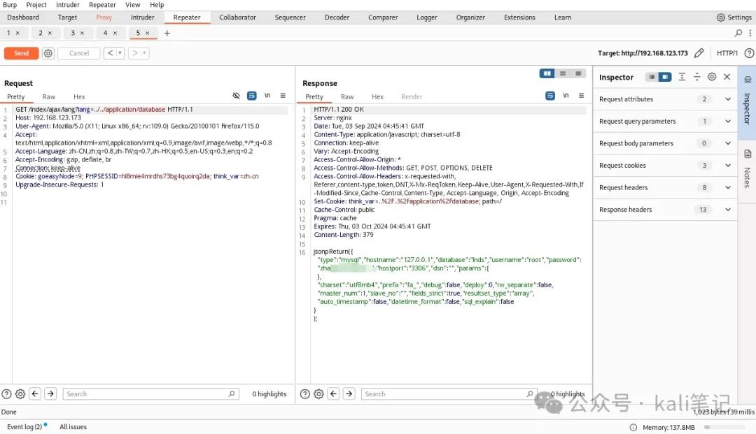 接下来,我们在burp中进行抓包,并将包发送到Repeater模块。将GET请求替换如下: