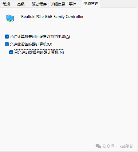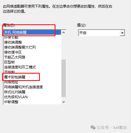 选项卡,将属性 关机 网络唤醒