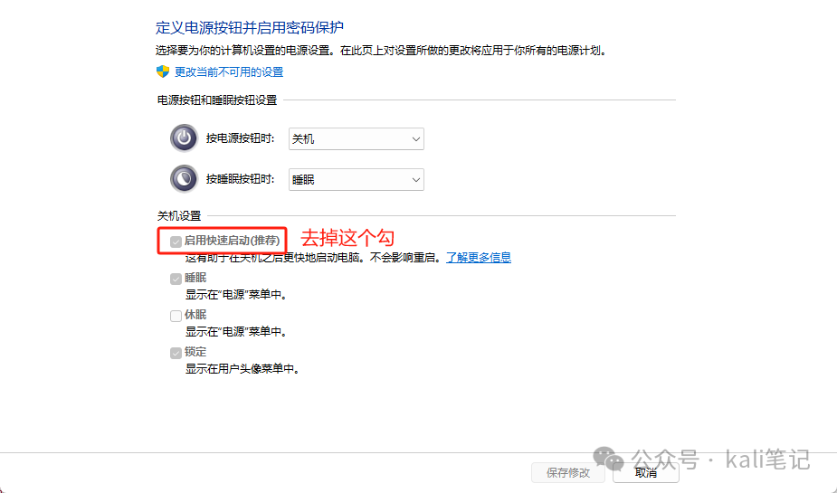在下面的 关机设置 里 取消勾选 启用快速启动(推荐)