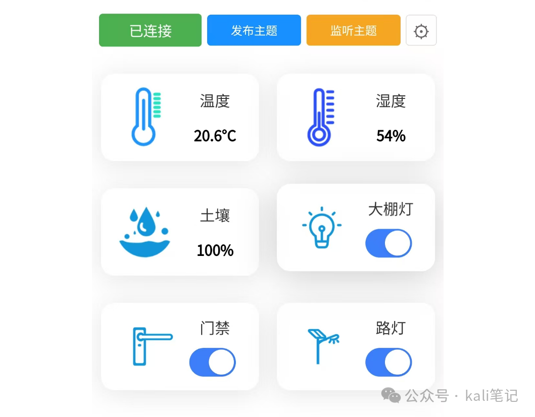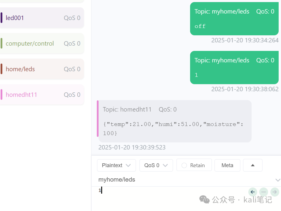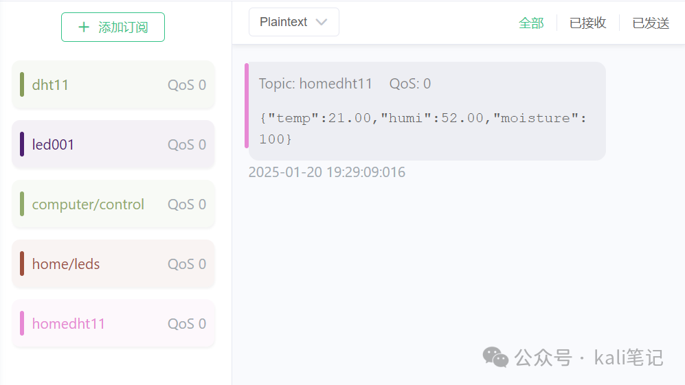 订阅主题为homedht11用于接收温湿度数据。格式为json类型。