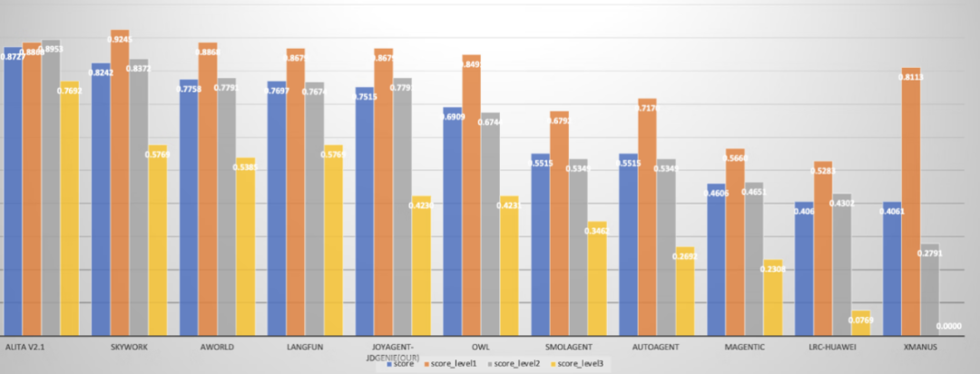 而 JoyAgent 智能体在 GAIA 榜单准确率达到 75.15%,这比 LRC-Huawei、xManus、AutoAgent 等产品的成绩都要好。其中,JoyAgent 在 Level 1 级任务的通过率达到了 86.79%,在 Level 3 级任务的通过率达到了 42.30% ,表现超出此前些许多媒体的预期。
