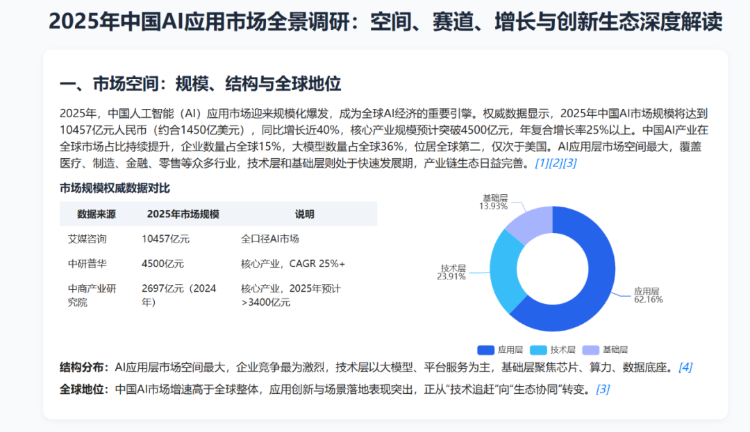 今年 AI 应用出现井喷,因此笔者要求 JoyAgent 调研 AI 应用市场的整体情况,Prompt 如下:请围绕当下中国 AI 应用市场做个调研,研究范围包括:AI 应用的市场空间、主流赛道、增长情况、创业团队情况、资本投入情况、技术采用情况。