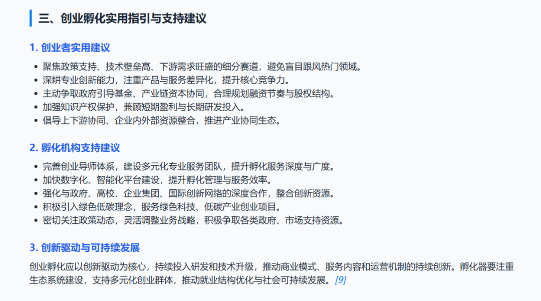 JoyAgent 对单一章节也能实现深度研究,并进一步丰富图表,但在排版上可能会出现一些遮挡的问题。接下来,笔者测试了 JoyAgent 对任务上下文的记忆和理解,希望 JoyAgent 能基于过往研究结果生成创业指导建议,Prompt 如下: