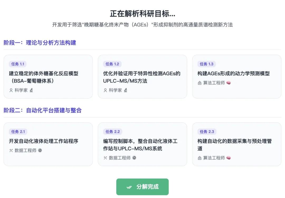 面向重大科学问题,建立撮合机制与激励体系,聚合科学家、AI开发者、工程师等多元力量。科学家主导研究规划与策略设计,数据工程师负责高效数据处理与算力优化,算法工程师构建科学模型、解析数据规律,实验工程师开展验证实验、提供真实数据与反馈、完成验证闭环。