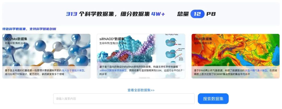 在星河启智平台上,数据是科研突破的关键「燃料」。上智院在平台上开放了多种高质量科学语料:(1)包含5000万分子构象的第一性原理(QM)分子构象数据集;(2)包含96000个化学修饰小干扰RNA序列的全球首个面向药物研发的siRNA修饰序列数据集;(3)迄今为止规模最大的全原子动态蛋白质数据集;(4)拥有覆盖2002年至2021年总量达6TB的FuXi次季节气象大模型预测数据集以及总量达23TB的FuXi中期集合气象大模型预测数据集。