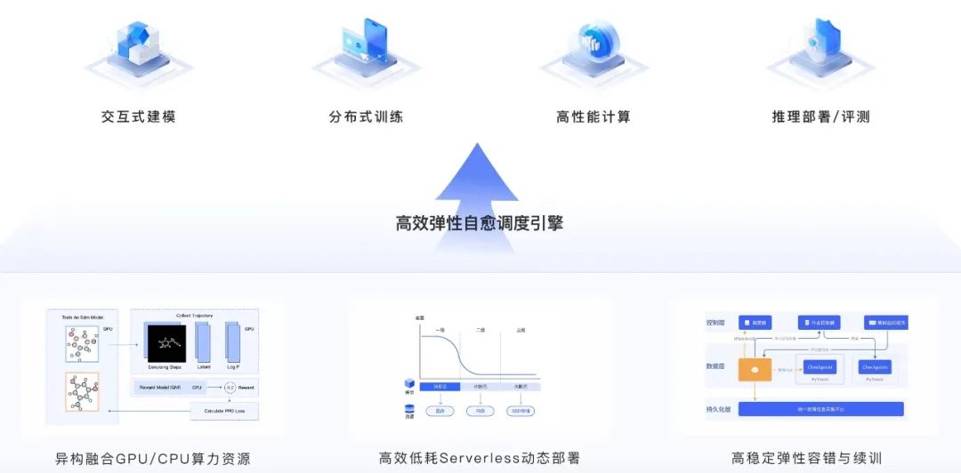 建设高稳定、高效率的科学智能算力服务平台,以GPU/CPU算力融合技术、模型动态部署及智能容错与续训,为前沿科学模型研发和应用提效;复杂科研任务处理从「小时级」加速至「分钟级」,计算效率提升99.7%,同等资源部署模型数翻倍,长周期训练实现零中断。