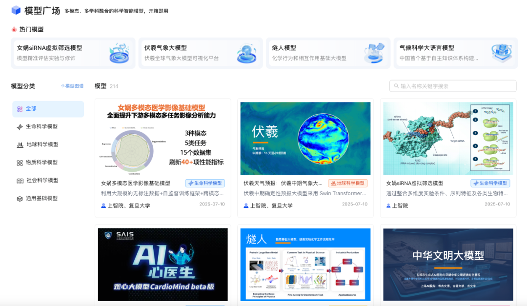 打造融合多模态、多学科的科学模型开放平台,已汇聚12个领域、40+机构的200+模型,实现最新前沿模型开箱即用,助力科研人员以低成本低门槛构建AI驱动的复杂科研链路。