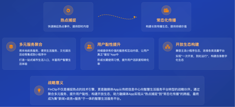 FinClip 等小程序容器技术的作用,在于降低这种转型的门槛 —— 无论融媒体 App 的规模大小、技术储备如何,都能通过轻量化接入快速拓展服务,让 “生态平台” 不再是头部媒体的专属,而是所有融媒体机构的可选项。