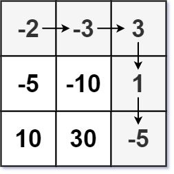 输入: dungeon = [[-2,-3,3],[-5,-10,1],[10,30,-5] ] 输出: 7 解释: 如果骑士遵循最佳路径:右 -> 右 -> 下 -> 下 ,则骑士的初始健康点数至少为 7 。