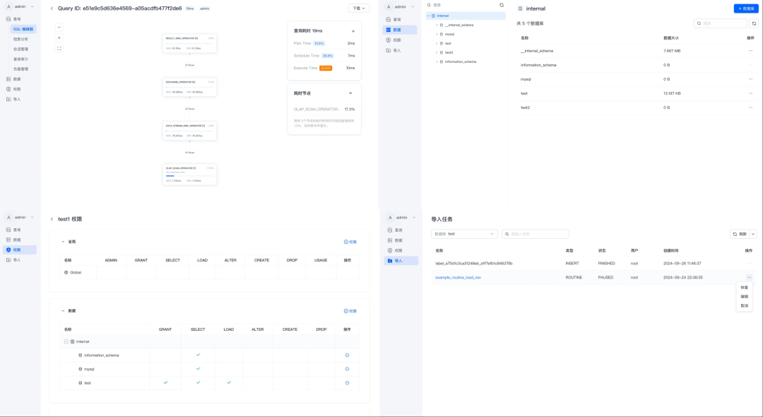 1. 查询:SQL 编辑器(多 Tab、自动保存、Profile分析)、日志过滤检索、会话实时监控与终止、慢查询审计、Workload Group 负载管理;