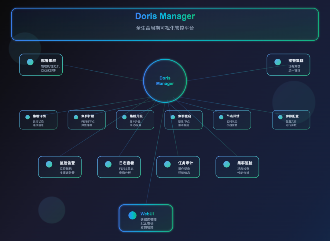 Manager Web Server:作为 Manager 的网页服务端与自动运维大脑,它内置元数据存储、Web API、用户认证及细粒度权限体系,并以可视化平台实现对 Apache/SelectDB Doris 集群的全生命周期运维。