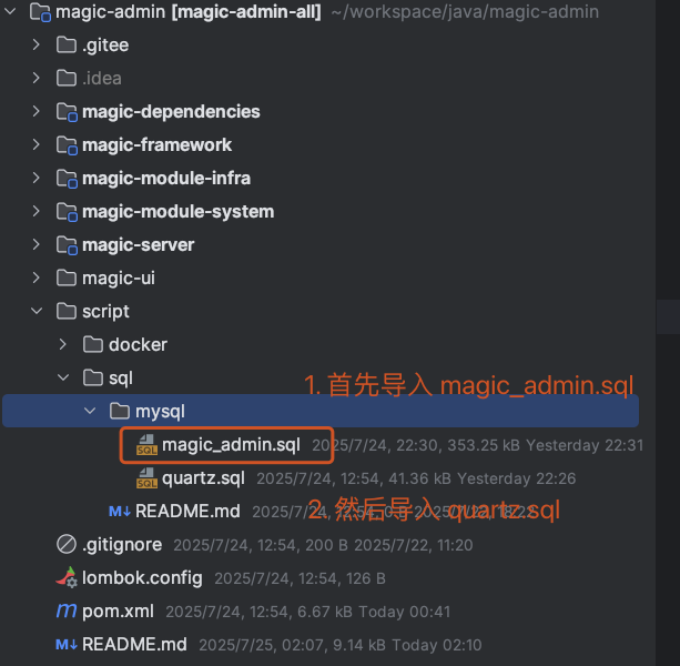 然后分别导入 magic_admin.sql ,quartz.sql 这两个文件。