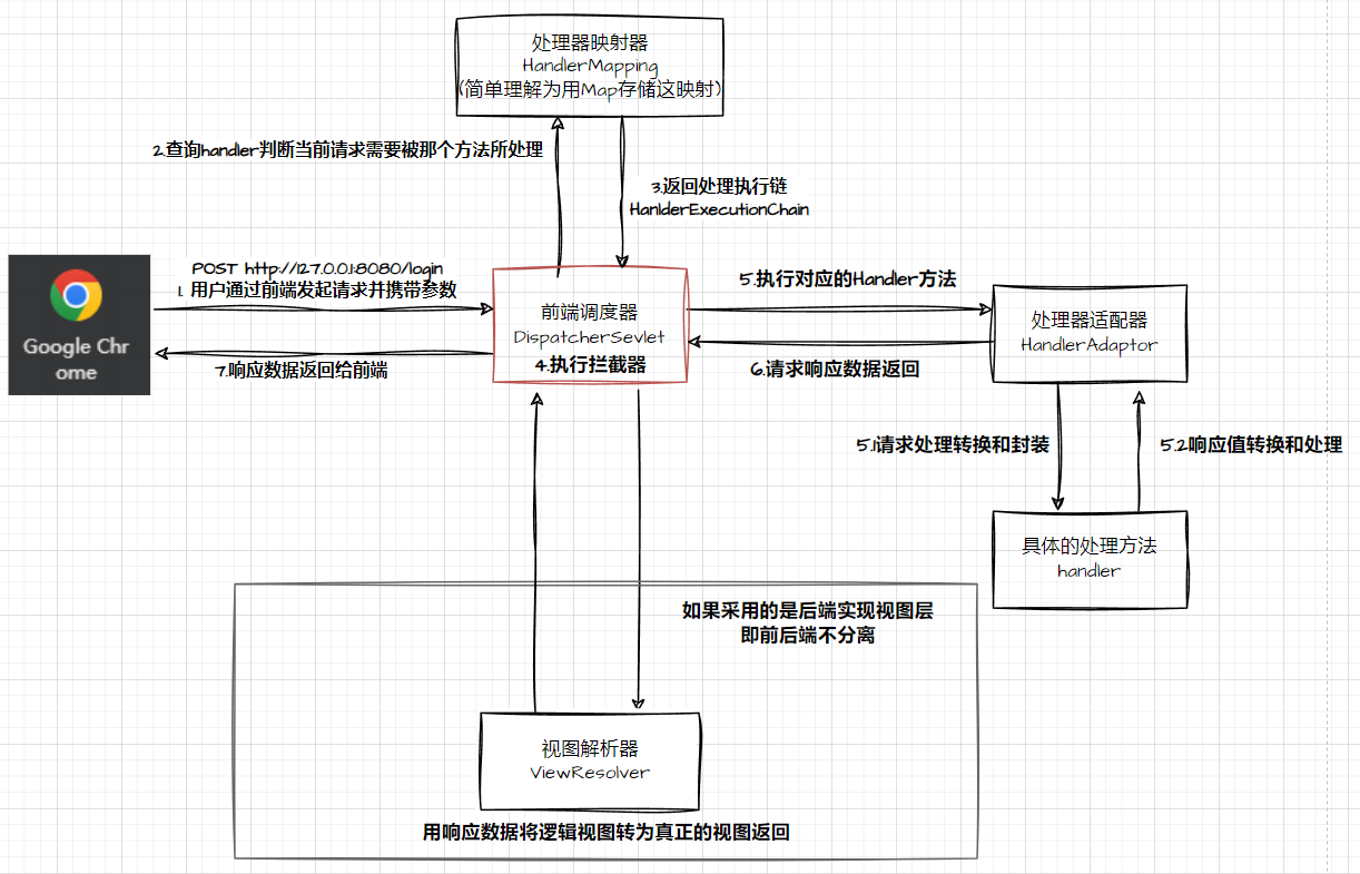 当用户发送一个请求过来,首先会经过前端调度器 DispatcherSevlet,通过 HandlerMapper(简单理解成 Map 存储映射),HandlerMapping 找到的其实是 HandlerExecutionChain ,它包含了拦截器和 handler,请求需要先进过拦截器的处理才会到最后的handler(也就是controller内的方法)