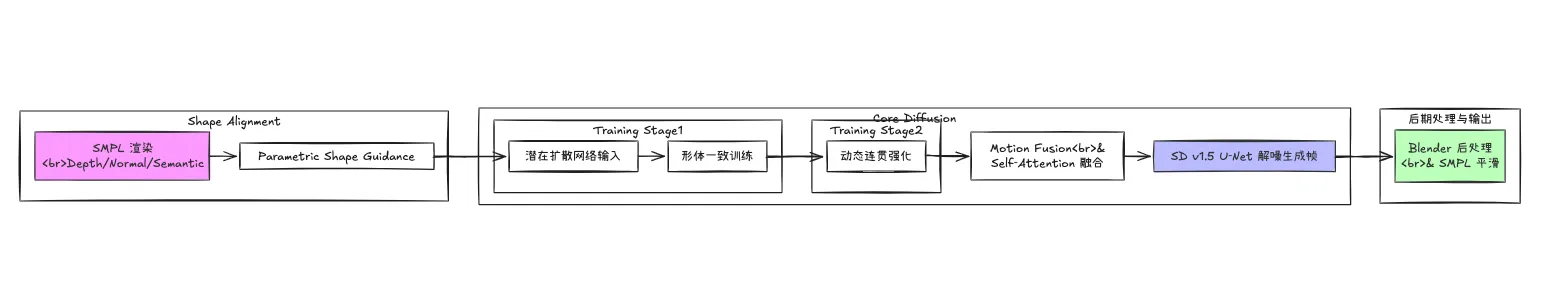 Champ | SMPL+扩散 | 三维形状统一 + 多模态融合 + 跨身份驱动 | 需装 Blender,显存要求高 |