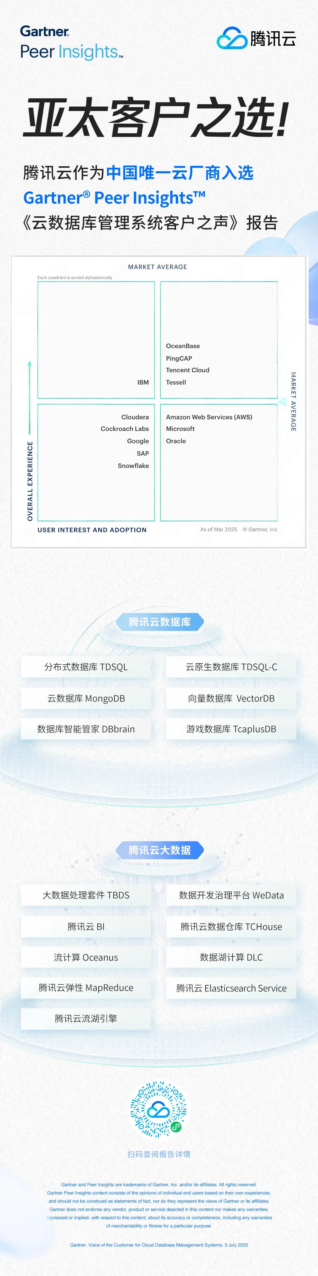 近日,全球权威研究机构Gartner发布了2025年《云数据库管理系统“客户之声”》报告。在截至今年5月的42条客户评价中,腾讯云以92%的推荐率位列亚太区“客户之选”第一象限。这是腾讯云连续两年获得该项荣誉,彰显其在全球数据管理领域的持续领导力。