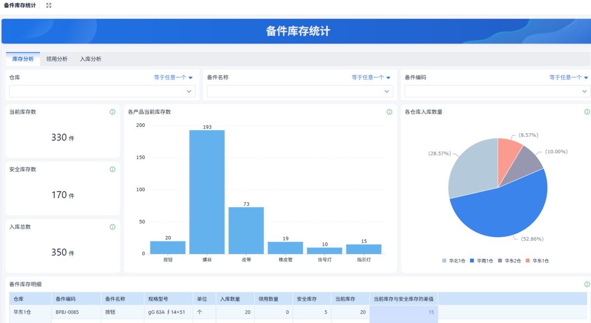 库存统计模块用于生成备件的库存报表,帮助管理人员清晰地了解当前库存的情况,避免积压和短缺。