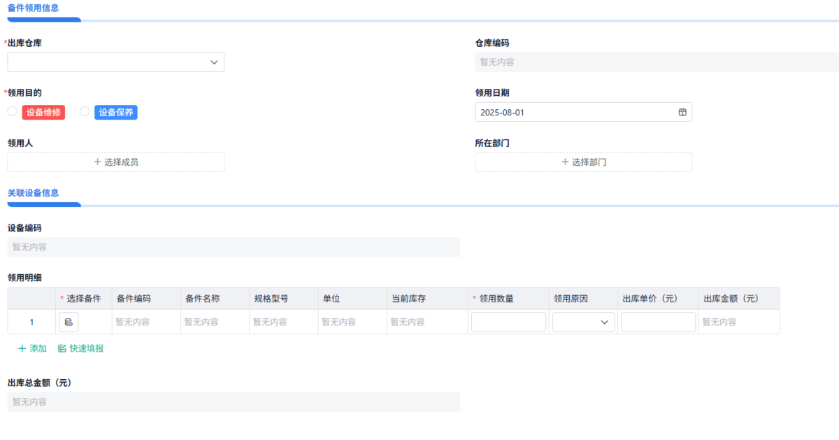 备件领用管理模块用于记录和管理备件的领用情况。通过此模块,企业可以实时掌握备件的消耗情况,避免过度采购和库存不足的情况。