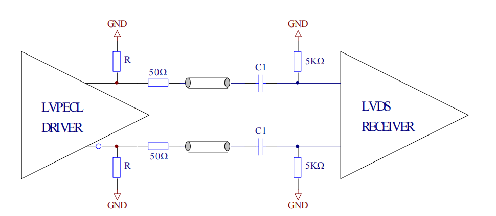 PECL 到LVDS 的交流耦合结构如图6 所示,PECL 的输出端到地需加直流偏置电阻R(270Ω~350Ω),