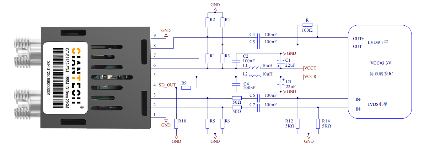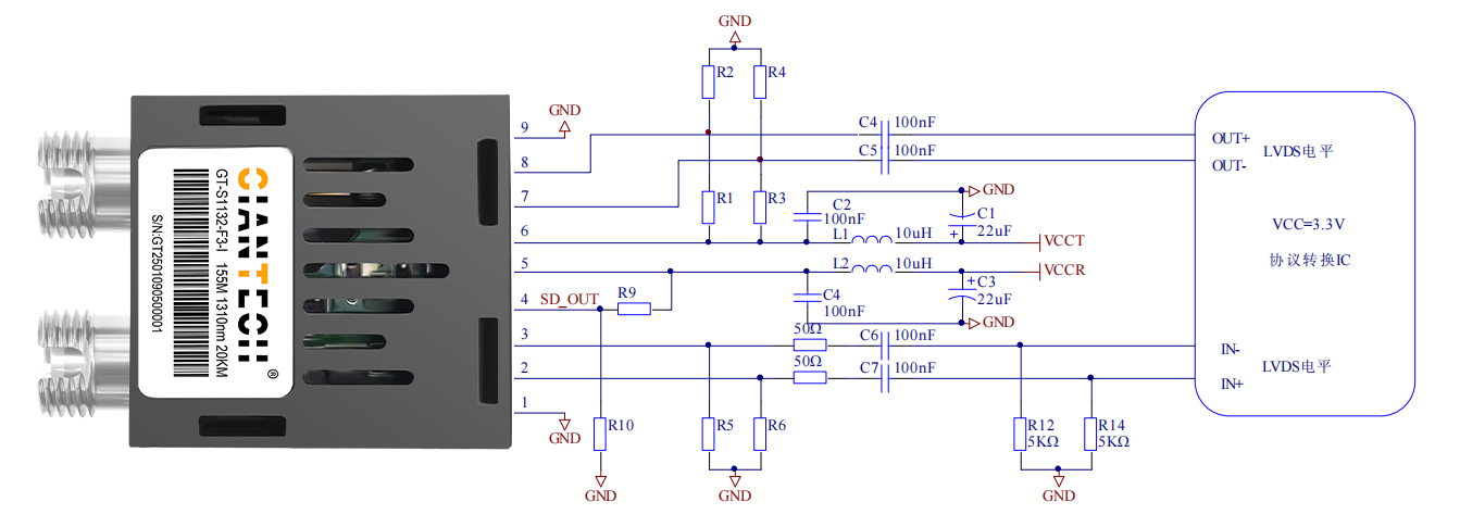 图 3 光模块与协议转换IC间LVPECL/LVDS电平的直流耦合
