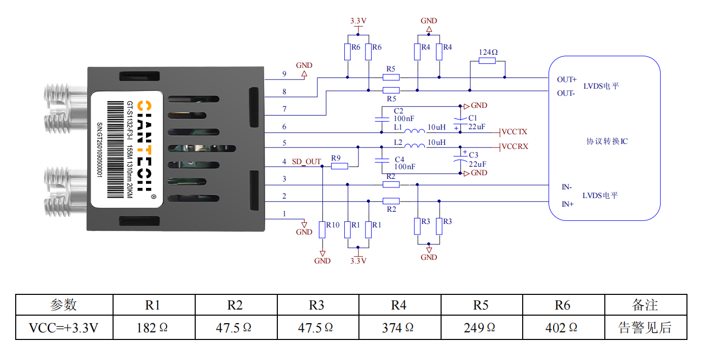 VCC=+3.3V | 2.7K Ω | 4.7K Ω | 140Ω~200Ω | 接上电阻 R=100Ω为低功耗电路 |