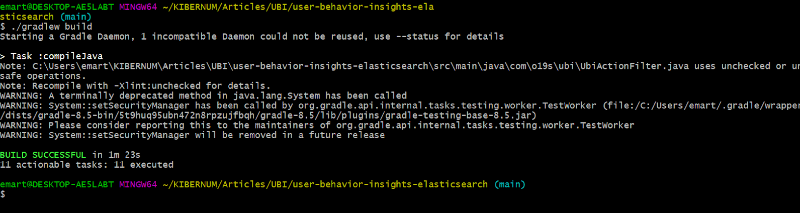压缩包会创建在 /build/distributions 文件夹下,并生成一个类似 elasticsearch-ubi-1.0.0-SNAPSHOT.zip 的 zip 文件。请保存以供后续使用。