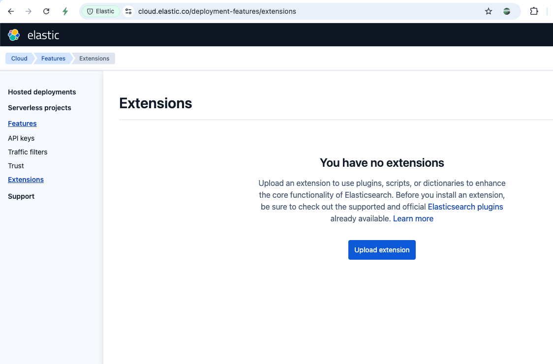 我们将在 Elastic Cloud 实例上安装插件。对于自我管理的部署,你可以参考文档中的步骤。