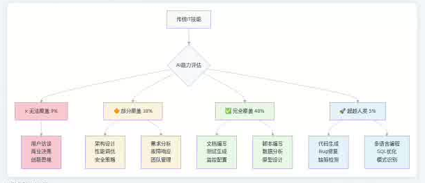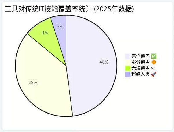 根据我们对五大IT角色的深度分析,AI工具对传统IT技能的覆盖情况呈现出明显的分层特征: