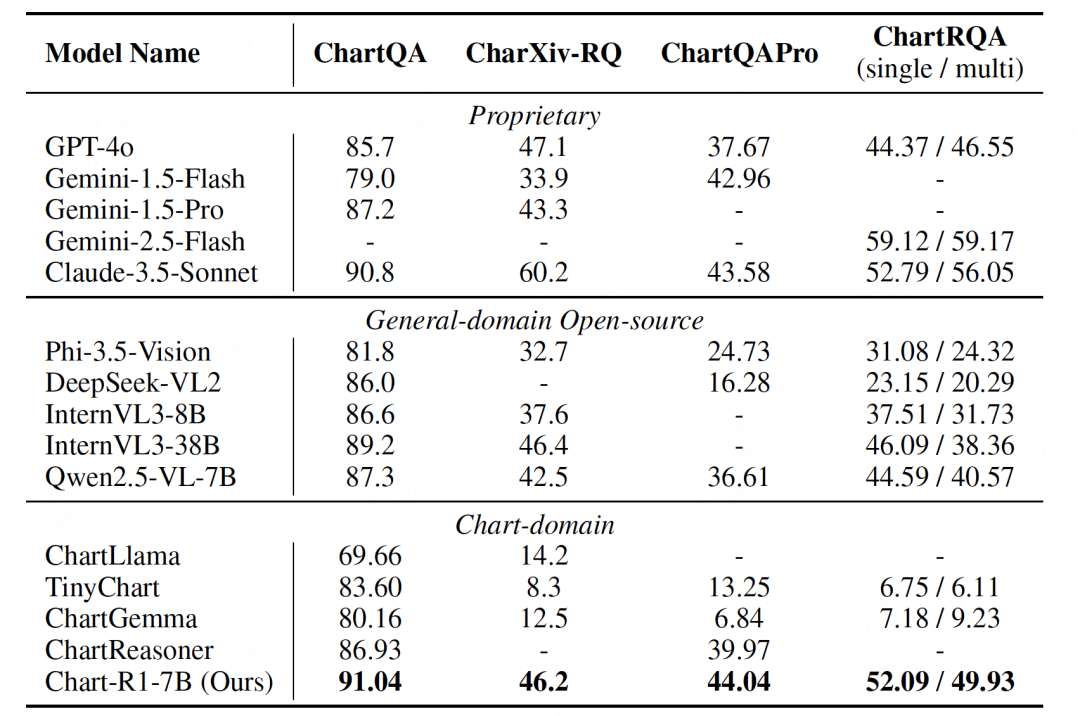 实验结果令人瞩目:Chart-R1 在各种公开基准测试和自建的 ChartRQA 数据集上表现卓越,不仅超越了现有的图表领域方法,甚至在多个任务上媲美 GPT-4o 和 Claude-3.5 等闭源大型模型。