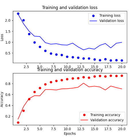 Host机器上运行 "train.py" 脚本,train.py脚本中包含了模型的创建和训练过程。模型的创建主要代码如下,使用Keras的function式 API(注意sequential 式API目前Vitis AI不支持)。创建的模型包含4个连续的Conv2D+Maxpolling层,然后跟随一个flatten layer, 一个dropout layer,以及两个全连接层。