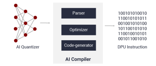 模型的编译需要用到Vitis AI compiler(VAI_C)。这个步骤实际上是把量化后的模型转化为可以在DPU上运行的指令序列。VAI_C 框架的简化流程如下图所示,包含模型解析,优化和代码生成三个阶段。模型解析步骤对模型的拓扑进行解析,生成用Xilinx的中间表示层(Intermediate Representation)表示的计算图(computation graph)。然后是执行一些优化操作,例如计算节点融合或者提高数据重用。最后的步骤是生成DPU架构上运行的指令序列。