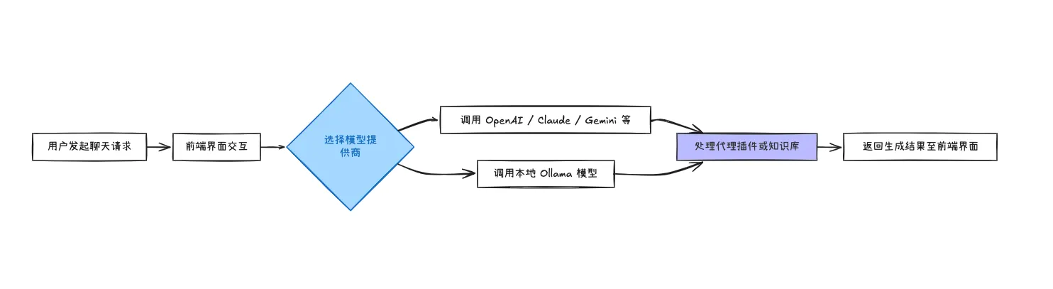 模型接入层 | 支持多厂商 API、本地模型 | 提供 OpenAI、Claude、Gemini、DeepSeek、Ollama 等选择灵活,适合个性化部署 |