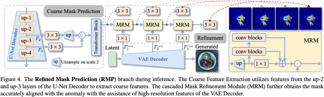 为提升异常掩码的像素级精度,SeaS 设计级联的精细化掩码预测(RMP)分⽀,嫁接于训练后的 U-Net,通过 「粗特征提取 + 精细优化」 两步⽣成精准掩码:
