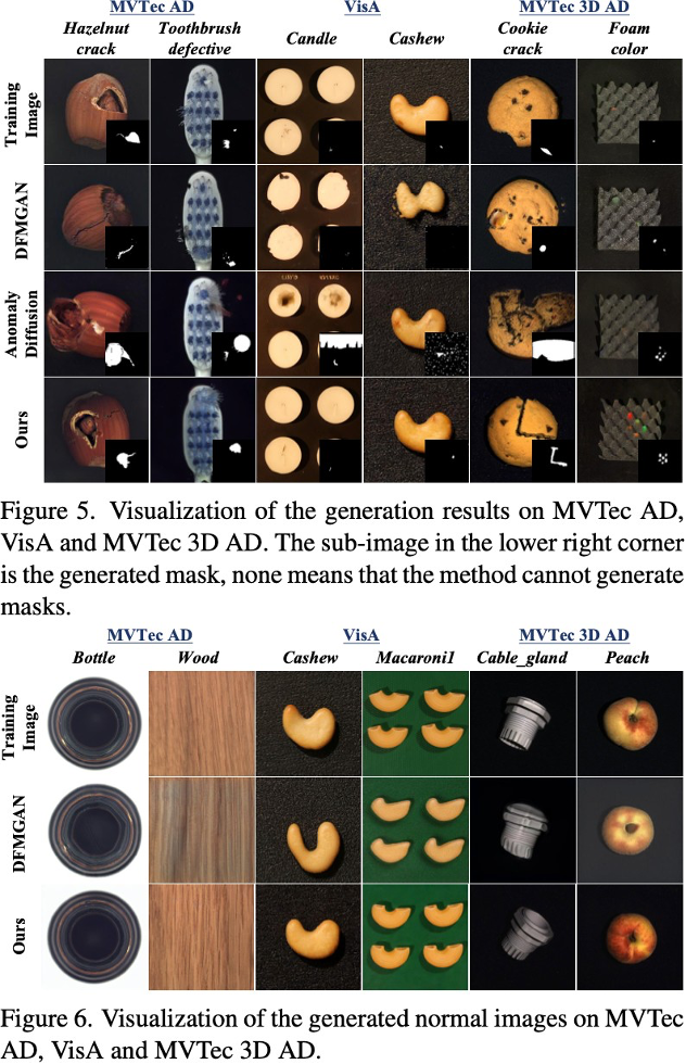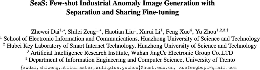 为此,华中科技⼤学慢⼯团队(SLOW Team)提出统⼀的少样本⼯业⽣成模型 SeaS。该模型依托 U-Net 的差异化学习能⼒,精准捕捉正常产品的细微变化与异常区域的丰富差异,仅需要 1-3 张训练样本,通过单⼀模型即可同步实现多样化异常⽣成、全局⼀致的正常产品合成及精确异常掩码标注⽣成,为⼯业场景⽣成任务建⽴了新的技术基准,有效推动了相关领域的技术进步。