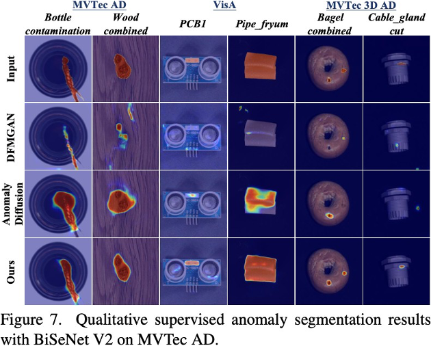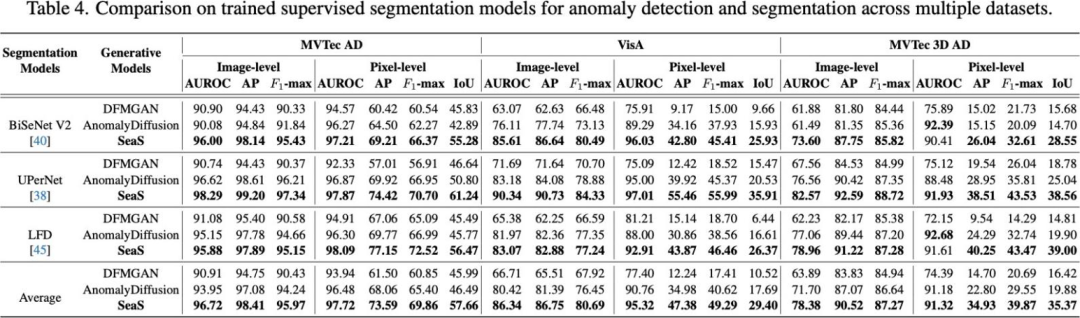 在异常分割中,LFD ⽤ SeaS ⽣成的图像 - 掩码对进⾏训练。它的模型⼤⼩仅 0.936M,远⼩于 BiSeNetV2(3.341M)和 UperNet(64.042M),但像素 AP 分数反⽽⾼出 5.34%,F1 分数⾼出 3.99%。