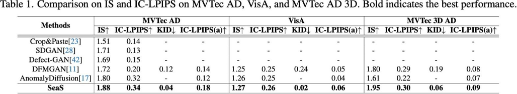 在少样本⼯业异常⽣成的关键指标⽐拼中,SeaS 表现突出: