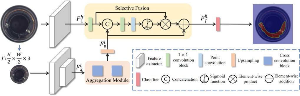LFD 采⽤双边结构设计:先通过空间细节分⽀,借助 ResNet-18 第⼀阶段提取低级特征;再通过上下⽂语义分⽀⾼效提取上下⽂特征,该分⽀对输⼊图像进⾏⾮对称下采样,还引⼊了聚合模块,能达到媲美 ResNet-18 第三阶段的感受野,计算量却更⼩。最后,通过选择性融合模块计算低级特征与上下⽂特征间的像素级注意⼒。