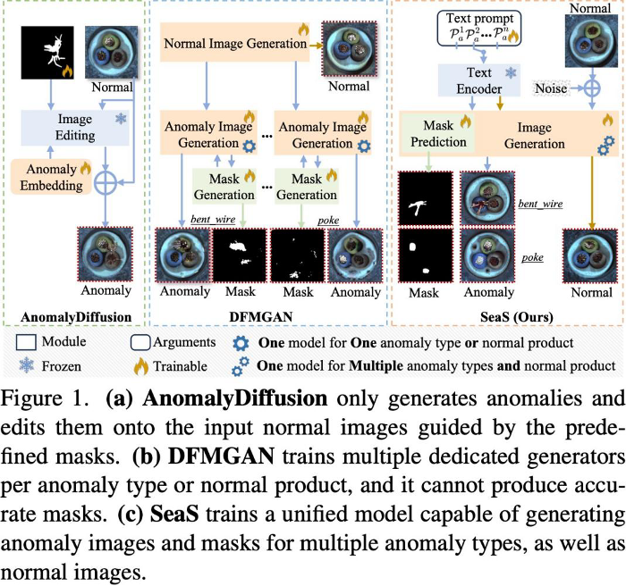 针对产业界对多样化异常样本⽣成、⾼效建模及精准掩码标注的需求,SeaS 基于 「异常区域变化丰富、正常产品变化细微」 的本质差异,实现了技术突破: