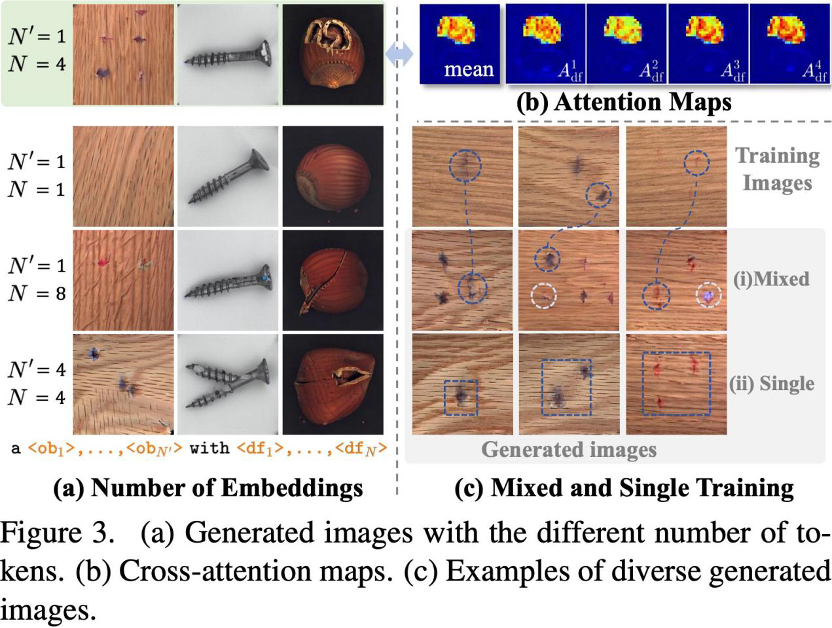 增加正常词元 <ob> 数量虽能提升⽣成多样性,但可能降低正常图像真实性并破坏全局⼀致性;⽽仅将单个 < ob> 与少量训练图像对⻬,⼜易出现过拟合。为此,SeaS 提出正常图像对⻬(NA)损失: