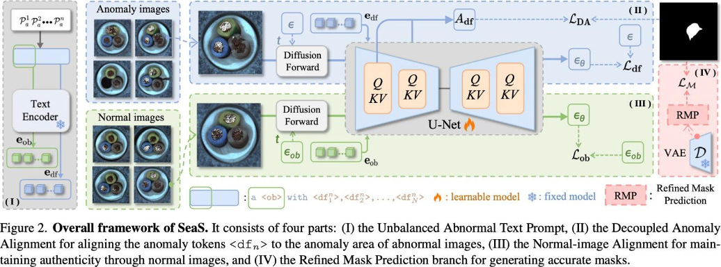 SeaS 的核⼼在于 「分离建模、共享学习」,仅需要少量的 1-3 张训练样本,通过同⼀个 U-Net 架构同时处理正常与异常的⽣成。具体流程为:
