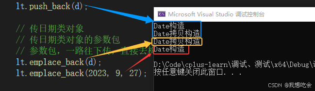 但在浅拷贝的类中,更能体现出emplace系列接口的价值,我们来看看在Date类(浅拷贝的类)中,emplace系列接口对性能的提升效果如何? 说明:这里简要实现了一个日期类,在其构造函数和拷贝构造中各打印一条提示语,便于观察。 我们接着测试list的emplace_back和push_back接口: