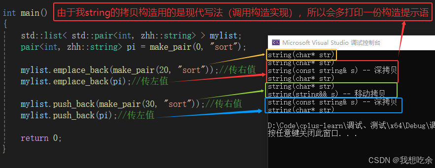 // emplace_back支持可变参数,可以用构建pair对象的参数后自己去创建一个匿名pair对象,然后用于构造list节点对象