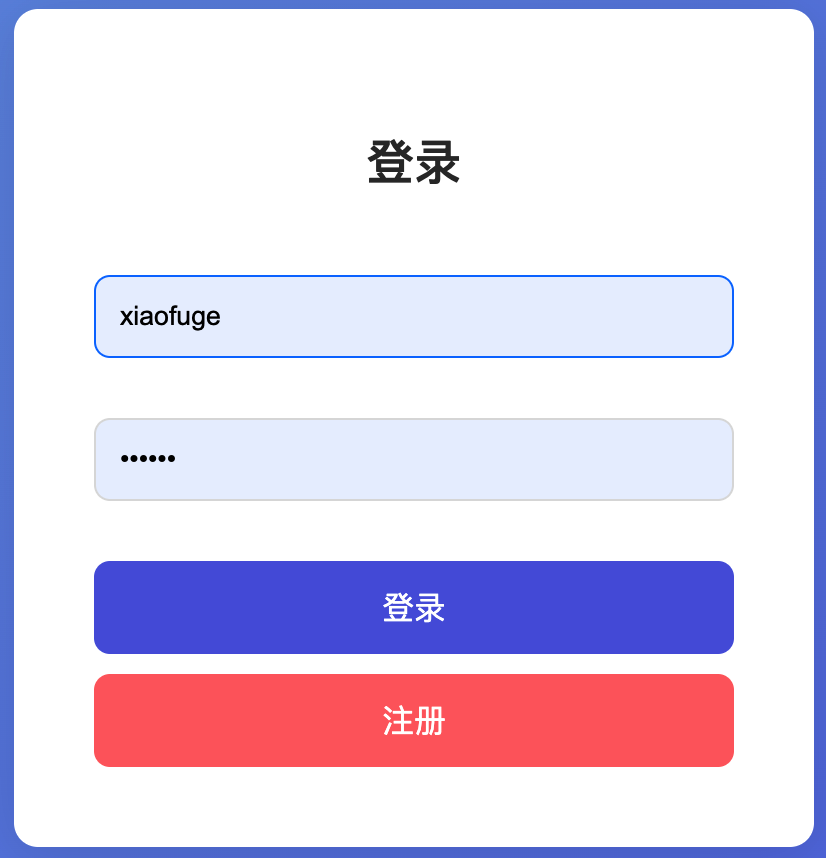 xiaofuge/123456、liergou/123456,xiaofuge 是 admin 权限,liergou 是 user 权限,你可以分别测试验证。document.addEventListener("DOMContentLoaded", function () {