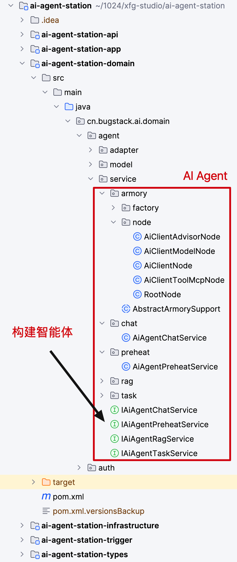 - Domain 核心领域层,处理 Agent 的预热、对话、知识库、任务的操作。后续 Agent 相关都维护到这个领域包下。