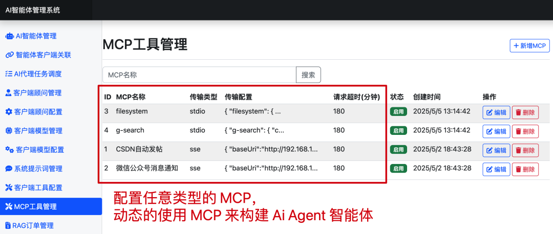 - 系统支持配置 stdio、sse,两种方式。无论是自己开发的 MCP 还是市面的都可以使用。(课程中有教大家,基于 Spring AI 怎么开发 MCP 服务)