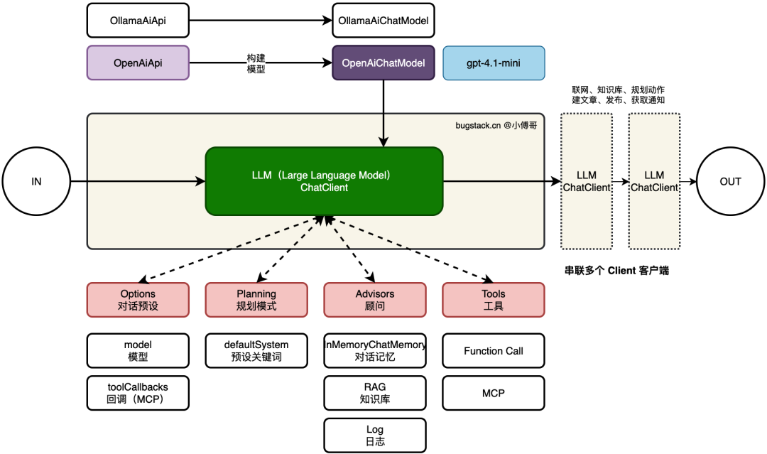 如图,以通过数据库表动态配置的手段,完成相关物料的加载,包括;模型(gpt-4.1/deepseek)、客户端、对话预设、执行规划(Planning)、顾问(记忆、RAG、日志)、工具(MCP)等,在把单个 Client 串联,完成整个 Agent 调用链。这样一个 Agent 调用链可以以对话形式使用或通过 Agent 动态任务自动执行。
